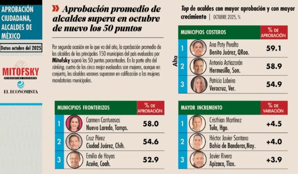 El estudio revela que, por segunda ocasión en lo que va del año, la aprobación promedio de los alcaldes del país superó los 50 puntos porcentuales, consolidando a Ana Paty como una de las figuras municipales con mayor respaldo social y liderazgo político en México.