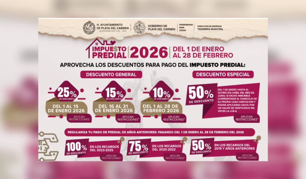 Playa del Carmen, Quintana Roo.- El Gobierno de Playa del Carmen, que encabeza la presidenta municipal Estefanía Mercado, inició el año con un estímulo fiscal para las familias playenses, al autorizar el Cabildo descuentos de hasta 25% en el pago anticipado del impuesto predial durante los primeros 15 días del mes de enero, como parte del Programa de Descuentos y Estímulos Fiscales 2026.