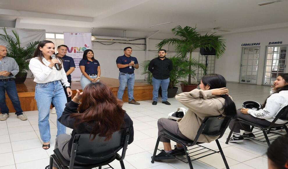 Cancún, Quintana Roo.- La Presidenta Municipal, Ana Paty Peralta, encabezó el programa “Yo no soy cómplice” etapa de realidad virtual “Vive Libre” que realiza el Instituto Municipal Contra las Adicciones (IMCA), dirigido a estudiantes del Centro de Bachillerato Tecnológico Industrial y de Servicios (CBTIS 111), con el objetivo de prevenir que se refugien en adicciones, y vivan su entorno positivo y saludable.