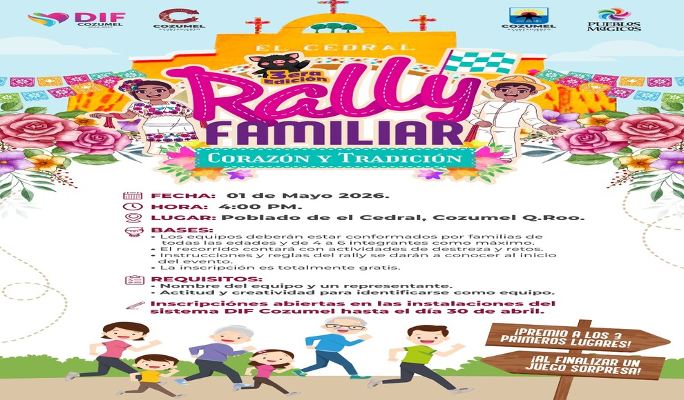 Cozumel, Quintana Roo.- Con el objetivo de fortalecer los lazos familiares y preservar nuestras raíces en el marco de las festividades del poblado de El Cedral, el Gobierno Municipal encabezado por el Presidente José Luis Chacón, en coordinación con la Presidenta Honoraria del Sistema DIF Cozumel, Diana Sosa Blanco, invitan a la comunidad a participar en la tercera edición del Rally Familiar “Corazón y Tradición”.