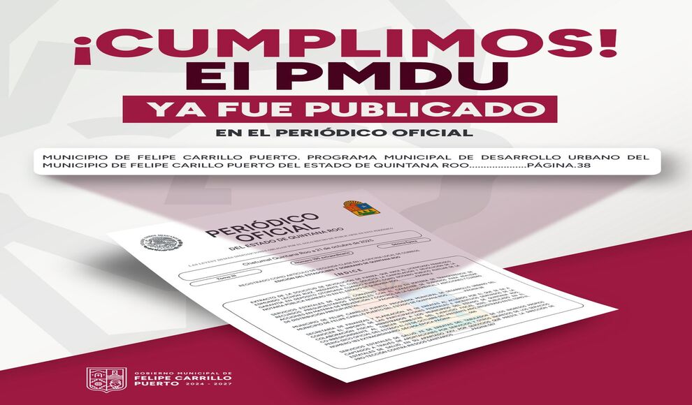 La alcaldesa celebró este importante logro, “Uno de mis mayores compromisos al ser electa fue lograr que Felipe Carrillo Puerto sea próspero y creciera con orden, nuestro PMDU ya está publicado en el Periódico Oficial. Gracias al trabajo en equipo entre los tres niveles de gobierno seguimos haciendo realidad el segundo piso de esta transformación”, destacó.