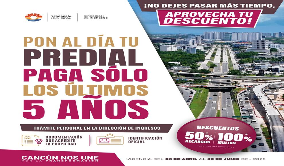Ana Paty Peralta exhortó a los habitantes a que acudan a la Dirección de Ingresos o a las jornadas itinerantes semanales del programa “Día del Pueblo. Cancún nos une por la transformación”, ya sea en el Palacio Municipal o en algún domo en diferentes puntos de la ciudad, en donde también se instala un módulo de atención de dicha dependencia para que los orienten sobre el procedimiento y el monto a liquidar, lo que dependerá del valor catastral del predio.