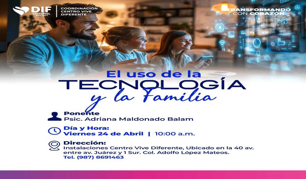 A través de la Coordinación del Centro Vive Diferente, se llevará a cabo la plática “El uso de la tecnología y la familia”, la cual será impartida por la psicóloga Adriana Maldonado Balam, el próximo 24 de abril a las 10:00 de la mañana, en las instalaciones ubicadas en la 40 avenida entre avenida Juárez y 1ª Sur, colonia Adolfo López Mateos, con un cupo limitado a 20 personas y dirigida a usuarios y a la ciudadanía en general.