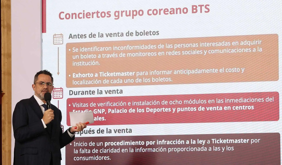 Durante la conferencia matutina del 26 de enero, el titular de Profeco, Iván Escalante, detalló que las irregularidades comenzaron incluso antes del inicio formal de la venta de boletos para los conciertos de BTS, programados para los días 7, 9 y 10 de mayo en el Estadio GNP de la Ciudad de México. Señaló que la información sobre precios, cargos adicionales y ubicación de los asientos no fue presentada de manera clara durante la preventa ni en la venta general.