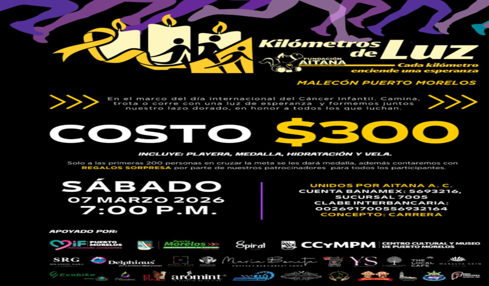 Puerto Morelos, Quintana Roo.- En el marco del Día Mundial del Cáncer Infantil, la Fundación Aitana anunció la carrera “Kilómetro de Luz”, que se llevará a cabo el próximo 7 de marzo en el Malecón de Puerto Morelos, con el objetivo de recaudar fondos y fortalecer el acompañamiento integral a niñas, niños y jóvenes que enfrentan esta enfermedad.