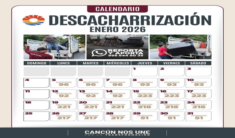 Cancún, Quintana Roo.- El Ayuntamiento de Benito Juárez, a través de la Dirección de Servicios Públicos, emitió su calendario mensual del programa de Descacharrización, para que durante enero los ciudadanos depositen debidamente muebles, electrónicos y diferentes artículos en desuso para mantener una ciudad más limpia y libre de focos de infección.