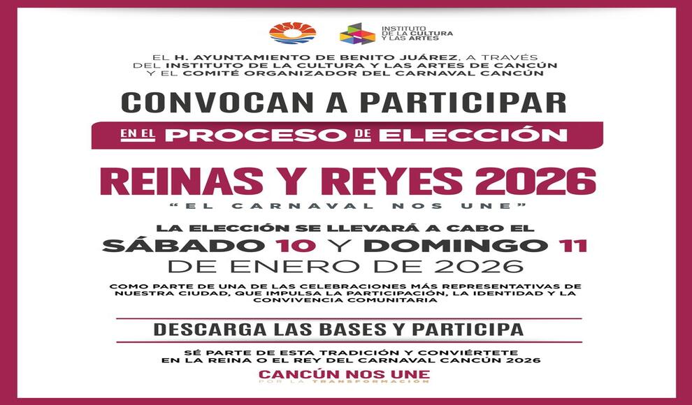 Cancún, Quintana Roo.- El Ayuntamiento de Benito Juárez, a través del Instituto de la Cultura y las Artes (ICA), convoca a las y los cancunenses a participar en el proceso de elección de Reinas y Reyes del Carnaval 2026, una de las festividades más emblemáticas de la ciudad, que promueve la participación, la identidad y la convivencia.