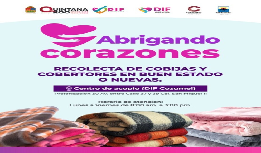 “Abrigando Corazones” recibe cobijas y cobertores nuevos o en buen estado en las instalaciones del DIF Cozumel, ubicadas en Prolongación 30 Av. entre calles 37 y 39, colonia San Miguel II, en un horario de atención de lunes a viernes de 8:00 a.m. a 3:00 p.m. Todo lo recaudado será entregado a personas adultas mayores, niñas, niños y familias en situación prioritaria.