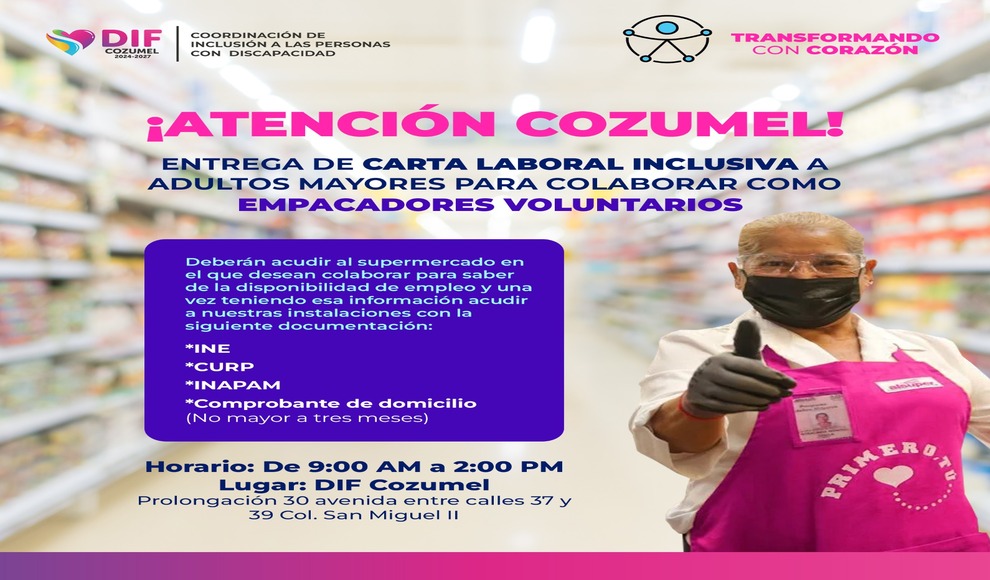 Cozumel, Quintana Roo.- Con el compromiso de fomentar un modelo económico más justo, incluyente y competitivo, el Gobierno Municipal que encabeza José Luis Chacón, junto al Sistema DIF Cozumel que preside Diana Sosa Blanco, a través de la Coordinación de Inclusión, pone a disposición de las personas adultas mayores la Carta Laboral Inclusiva para colaborar como empacadores voluntarios en supermercados de la isla.