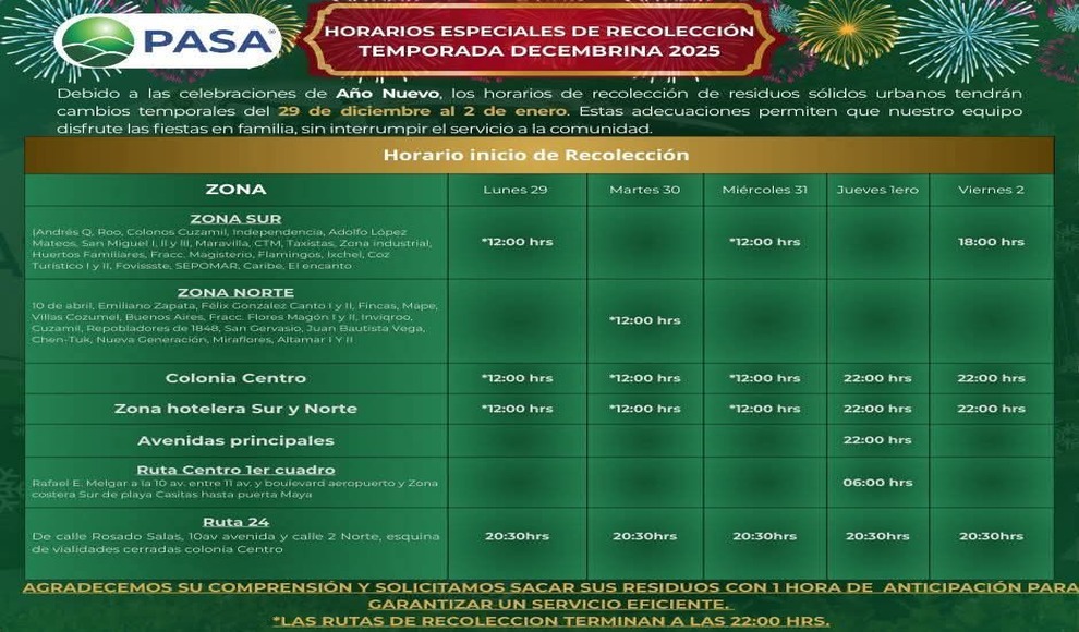 Cozumel, Quintana Roo.- El Gobierno Municipal de Cozumel, que preside José Luis Chacón Méndez, en coordinación con la empresa Promotora Ambiental S.A. (PASA), informó a la ciudadanía sobre ajustes temporales en los horarios de inicio del servicio de recolección de residuos sólidos urbanos, con motivo de las celebraciones de fin de año.