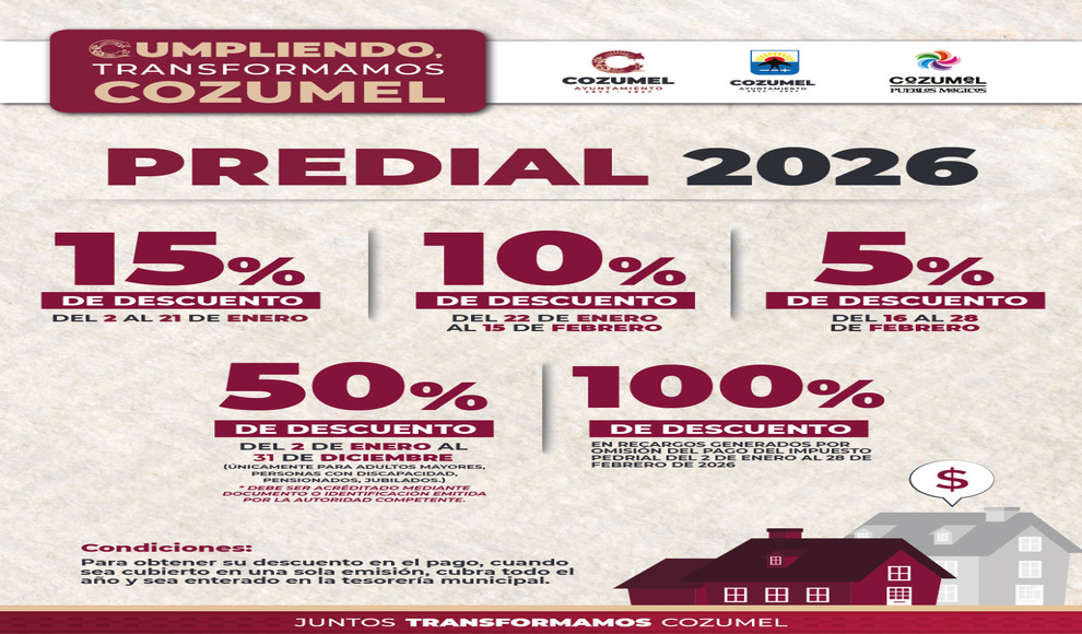 “Cumpliendo Transformamos Cozumel” contempla en la primera fecha, del 2 al 21 de enero el 15 por ciento de descuento en el pago en una sola exhibición del Impuesto Predial y del 2 de enero al 28 de febrero el 10 por ciento de descuento en el pago por el servicio se recoja de basura en casa habitación y local comercial, así como también el 20 por cuento de descuento a inscritos en el convenio “Blindaje Cozumel” avalados por Seguridad Pública y/o la Secretaría de Seguridad Ciudad.