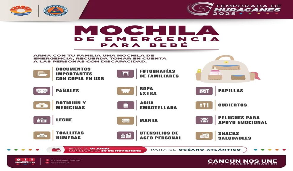 Cancún, Quintana Roo.- Ante la Temporada de Lluvias y Ciclones Tropicales 2025, el Ayuntamiento de Benito Juárez, a través de la Dirección General de Protección Civil, dio a conocer la importancia de tener una “Mochila de Emergencia para Bebé” en casa, a fin garantizar la seguridad entre los infantes, en caso de un fenómeno hidrometeorológico.