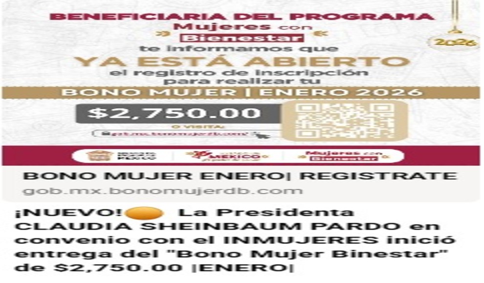- Circula en redes sociales y WhatsApp un supuesto Bono Mujer 2026, presuntamente vinculado a Mujeres con Bienestar.