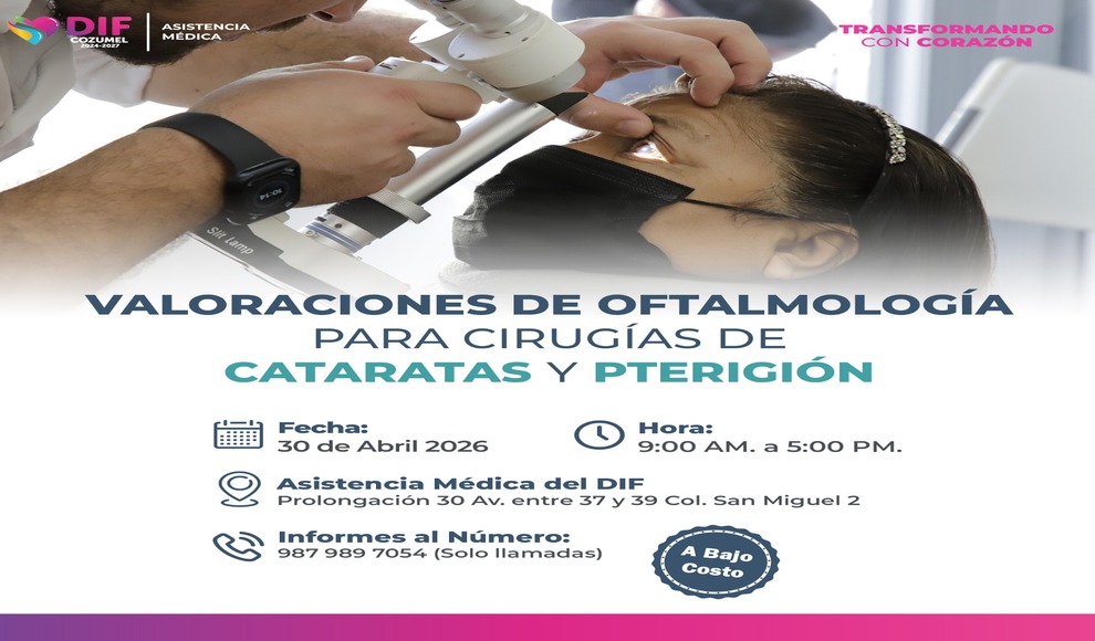 Cozumel, Quintana Roo.- Con el objetivo de fortalecer el acceso a servicios de salud visual y mejorar la calidad de vida de las familias cozumeleñas, el Gobierno de José Luis Chacón, a través del Sistema DIF Cozumel que encabeza la Presidenta Honoraria, Diana Sosa Blanco, invita a la ciudadanía a participar en la jornada de valoraciones oftalmológicas.