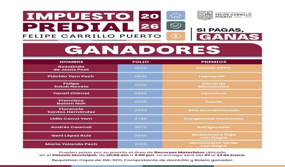 Felipe Carrillo Puerto, Q. Roo.- La Presidenta Municipal de Felipe Carrillo Puerto, Mary Hernández, encabezó la rifa de estímulos del Impuesto Predial 2026, en la que 10 Carrilloportenses resultaron ganadores de valiosos premios como parte de un compromiso con la ciudadanía.