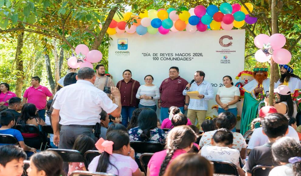 Cozumel, Quintana Roo. – Con el objetivo de llevar alegría, unión familiar y tradición a las comunidades más alejadas de la isla, el Presidente Municipal de Cozumel acudió al asentamiento Las Fincas, donde compartió la tradicional Rosca de Reyes y realizó la entrega juguetes a niñas y niños, como parte de la iniciativa "Día de Reyes Magos 2026, 100 Comunidades" impulsada por la Gobernadora del Estado, Mara Lezama para llevar la magia de esta festividad a los sitios más remotos del Estado.