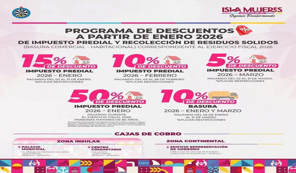 De manera especial, el Gobierno de Isla Mujeres refrenda su compromiso con los sectores más vulnerables y recuerda que durante todo el ejercicio fiscal 2026 se mantiene un descuento del 50 % en el pago del Impuesto Predial para personas mayores de 60 años, beneficio que aplica a un solo inmueble por contribuyente, siempre que corresponda a su casa habitación y cumpla con los requisitos establecidos.