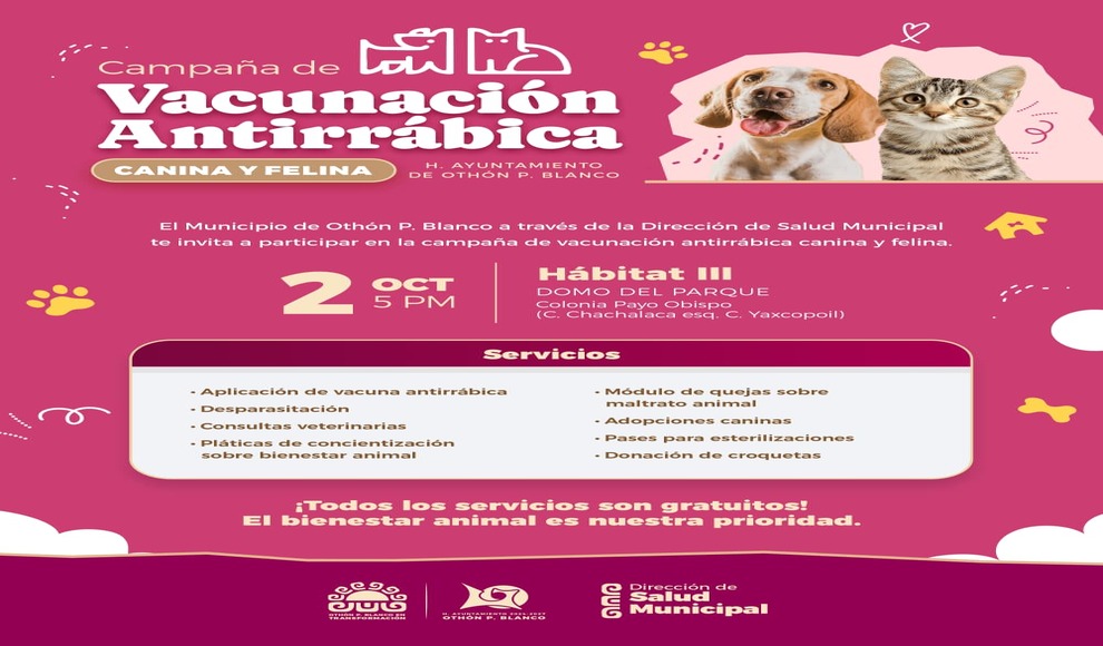 Chetumal, Quintana Roo.- Por un municipio que ama, cuida y protege a los animales, la presidenta municipal de Othón P. Blanco, Yensunni Martínez Hernández, invitó a toda la ciudadanía a sumarse a la campaña municipal de Vacunación Antirrábica 2025 Canina y Felina, a realizarse este jueves 02 de octubre a partir de las 5 de la tarde en el domo del Parque Hábitat III de la capital del estado.