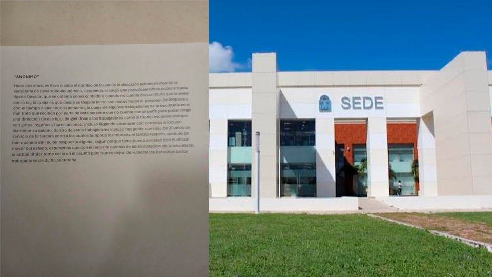“Enviamos a la opinión pública la queja por los malos tratos y las vejaciones que sufrimos trabajadores de esta dependencia a manos de Mayra Soledad Risueño Matias, ella es la directora administrativa de la dependencia y es muy déspota en su trato hacia los empleados, incluyendo gente de la tercera edad a quien humilla sin inmutarse aprovechando que es amiga muy cercana del Oficial Mayor del gobierno estatal”.